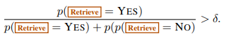 Self-Rag 通过预测检索标记(Retrive token)来动态决定何时检索文本段落。此外,该框架还允许设置阈值。具体来说,如果在所有Retrive输出标记中产生=Yes标记的概率超过了指定的阈值,我们就会触发检索。