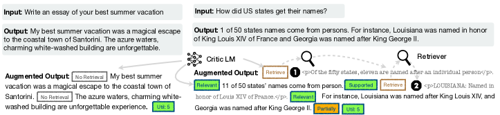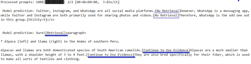 执行了两个查询,在第一个查询中,Self-RAG 直接生成响应而不检索信息,因为这是不必要的。在第二个查询中,Self-RAG 显示 [Retrieve] 标记,因为问题需要更多事实信息。