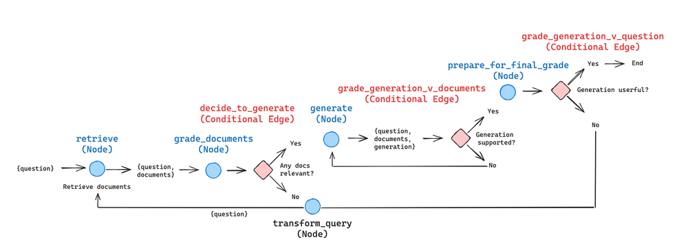 这个实现也是体现RAG Flow,体现 RAG 的 “流程工程(flow engineering) “的例子,包括特定的决策点(如文档分级)和循环(如重试检索)。