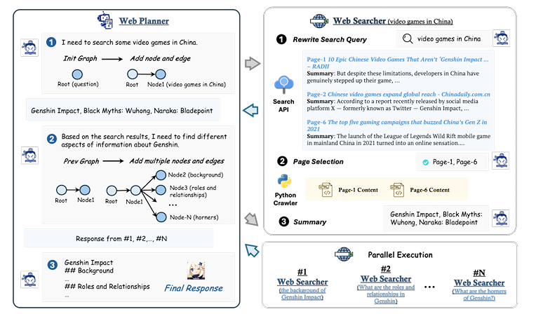 它由两个主要组件组成:WebPlanner 和 WebSearcher。WebPlanner 将用户的问题分解为部分搜索任务,并根据搜索结果确定下一步。这一过程使用图结构表示。同时,WebSearcher 执行分层信息搜索,以收集相关信息。